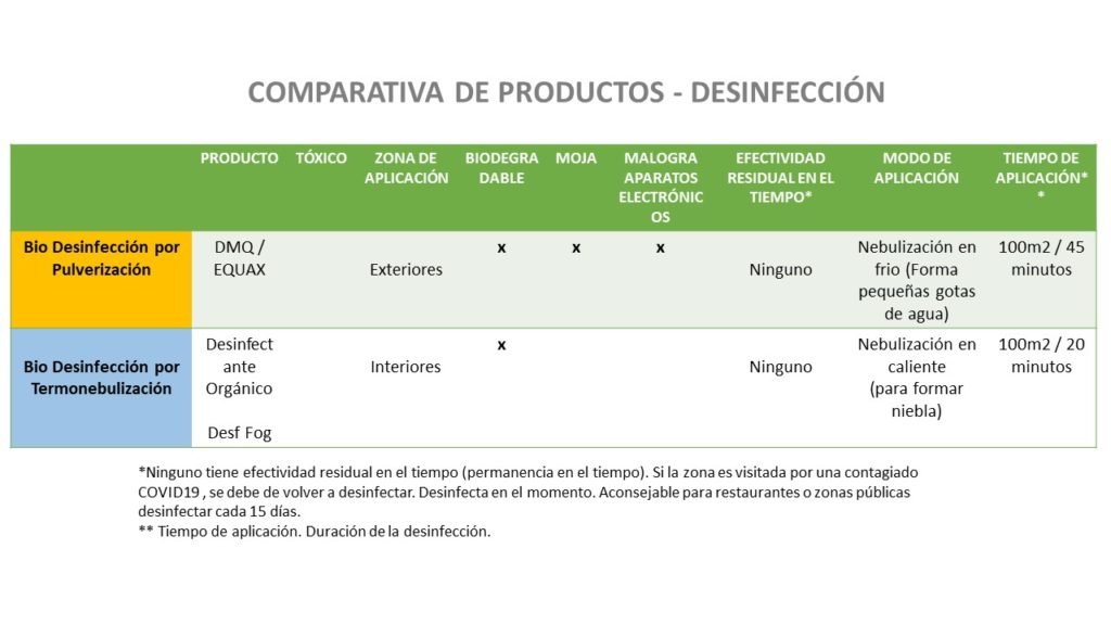 Usamos un desinfectante orgánico llamado Desf Fog que es un producto Nebulizable al Calor formando una densa Niebla que permite desinfectar hasta el ultimo rincón del Inmueble.